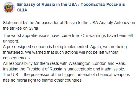 «Худшие опасения оправдались. Предостережения РФ не услышали. Нам опять грозят. Мы уже предупреждали, что подобные действия не останутся без последствий», - резюмировал А.Антонов, посол РФ в Вашингтоне.